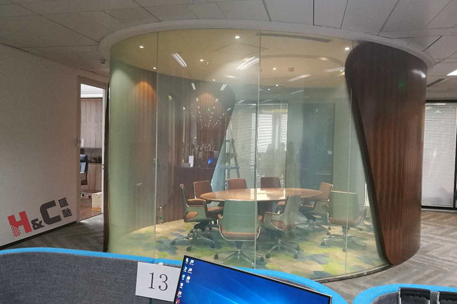 該辦公區(qū)域使用調(diào)光玻璃的地方很多,原來(lái)的一個(gè)大空間被分隔為幾個(gè)獨(dú)立的辦公室和會(huì)議室。平玻與彎玻相結(jié)合,弧形調(diào)光玻璃的圓角設(shè)計(jì)也與大樓的承重圓柱交相呼映,完美詮釋了高檔辦公室的內(nèi)涵。