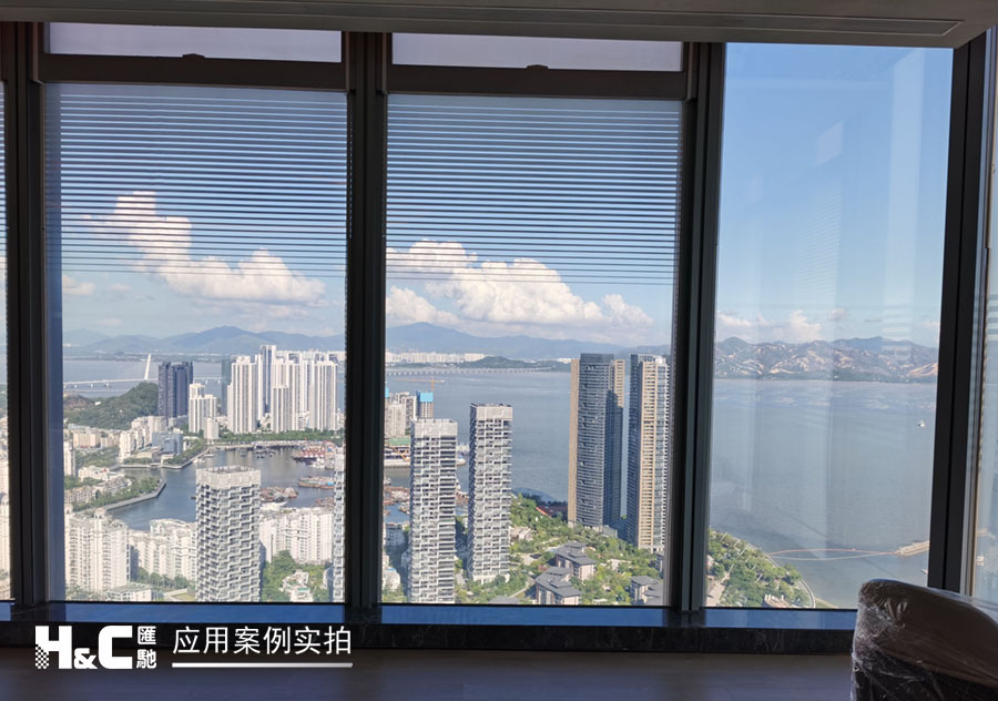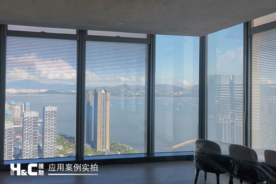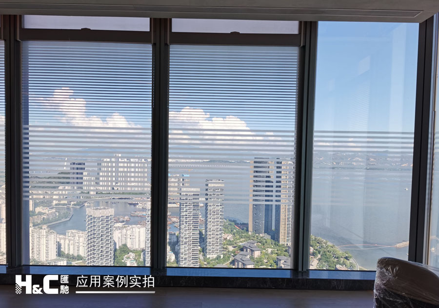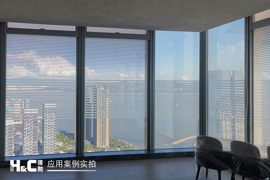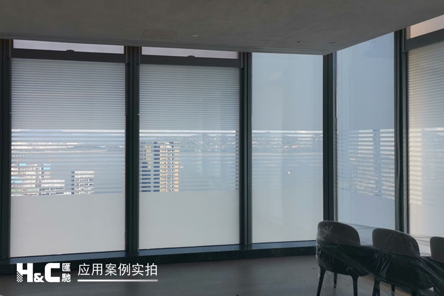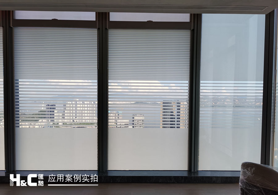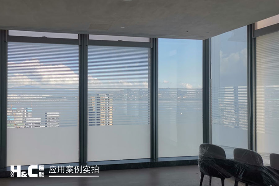 外立面的玻璃采光極好,但有時(shí)室外復(fù)雜的光線(xiàn)也會(huì)對(duì)室內(nèi)造成困擾。本案業(yè)主采用了廣州匯馳實(shí)業(yè)提供的百葉調(diào)光膜,貼在玻璃內(nèi)表面,讓普通玻璃變成調(diào)光玻璃。百葉的變化效果可以用遙控調(diào)控,有效控制光線(xiàn)的進(jìn)入,讓玻璃變得更有科技感。